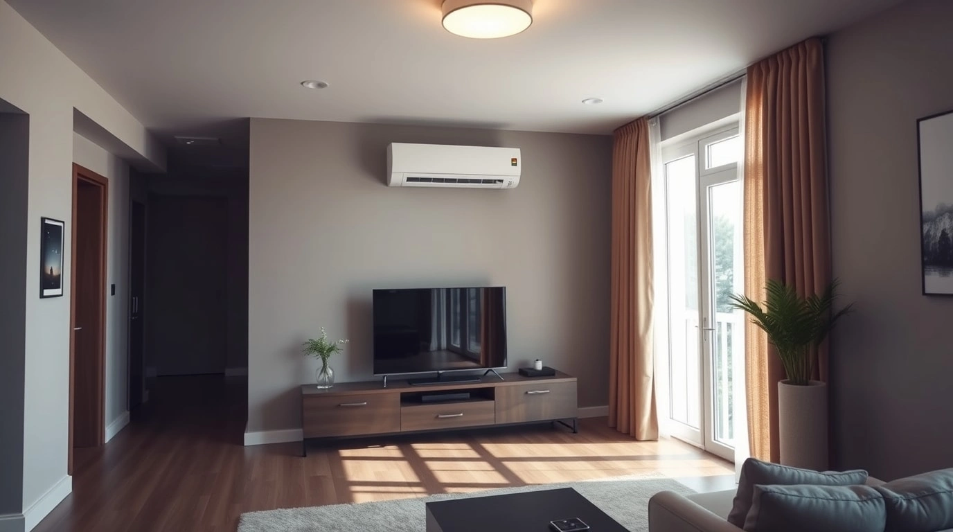 Eine Luft-Luft-Wärmepumpe in einem modernen Wohnraum, die mit einer Fußbodenheizung kombiniert ist.
