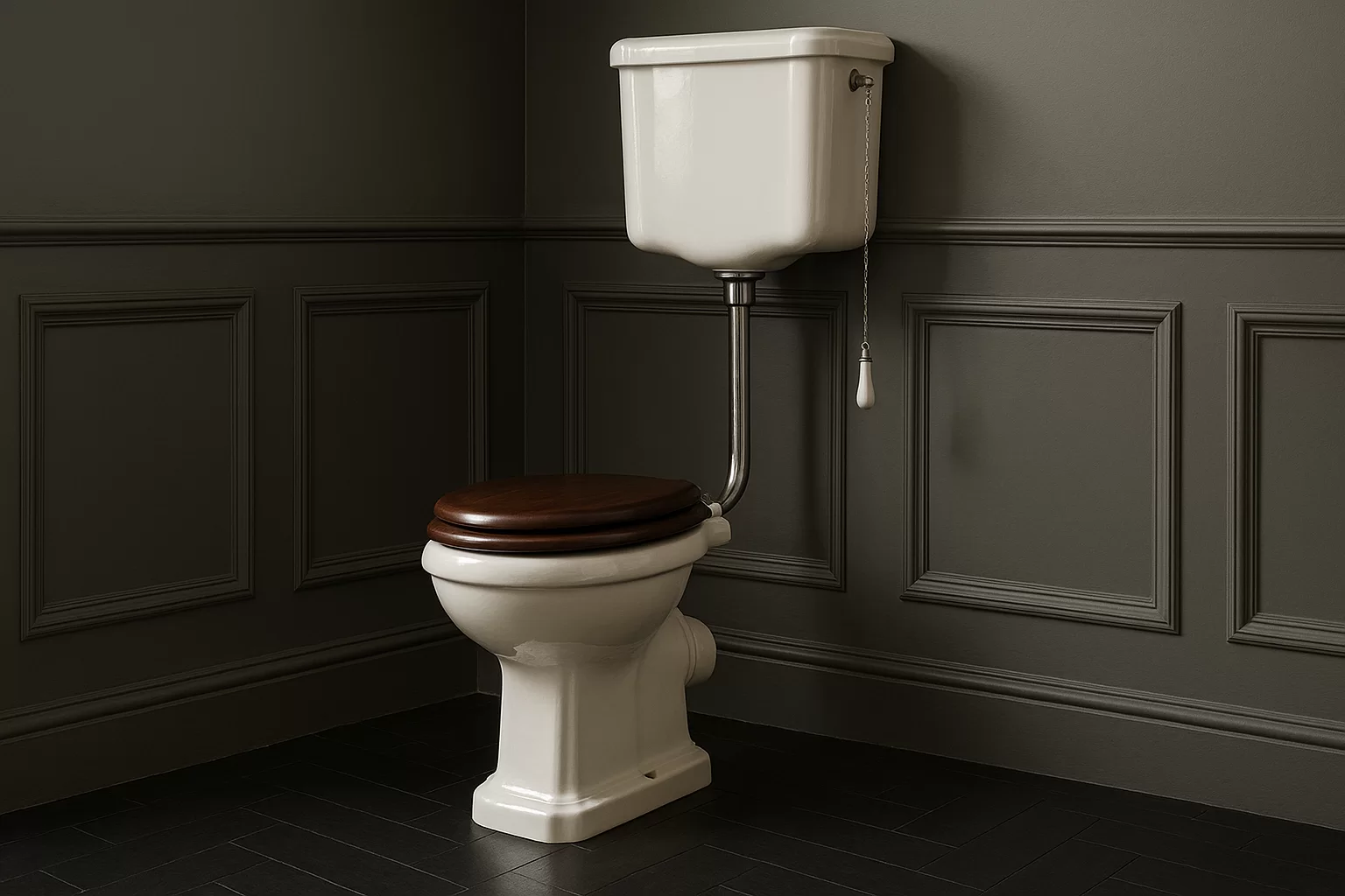 Besondere Stile wie wandhängende Toilettenschüsseln mit runden Designs und oberhalb angebrachten Spülkästen sind oft von den 1920er bis 1930er Jahren inspiriert.