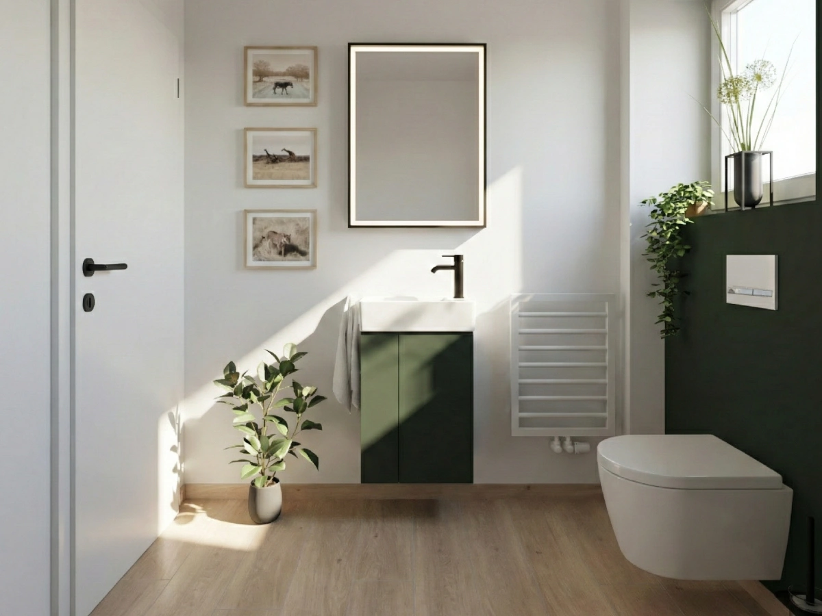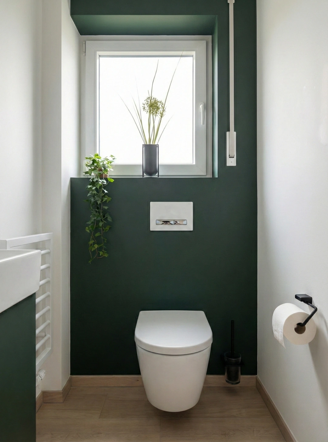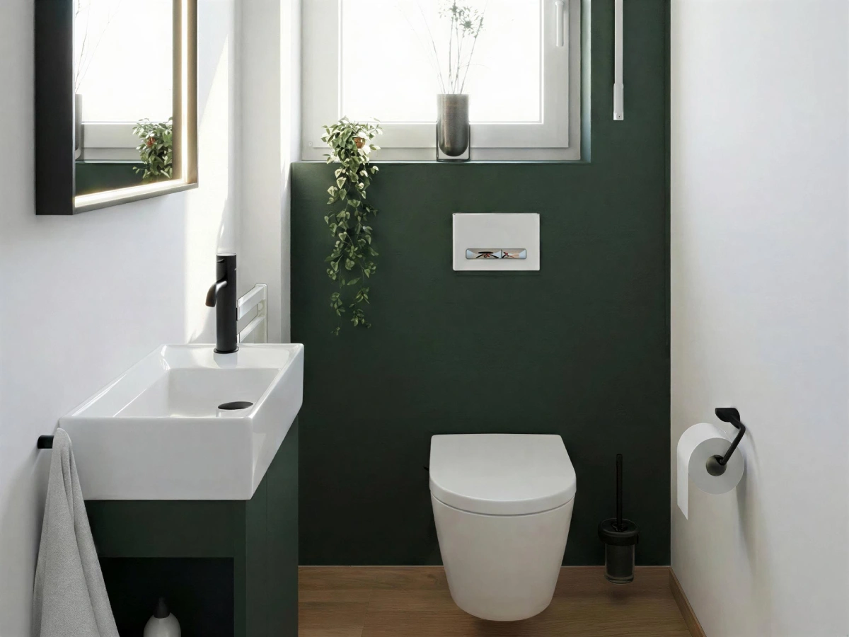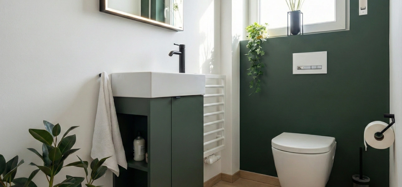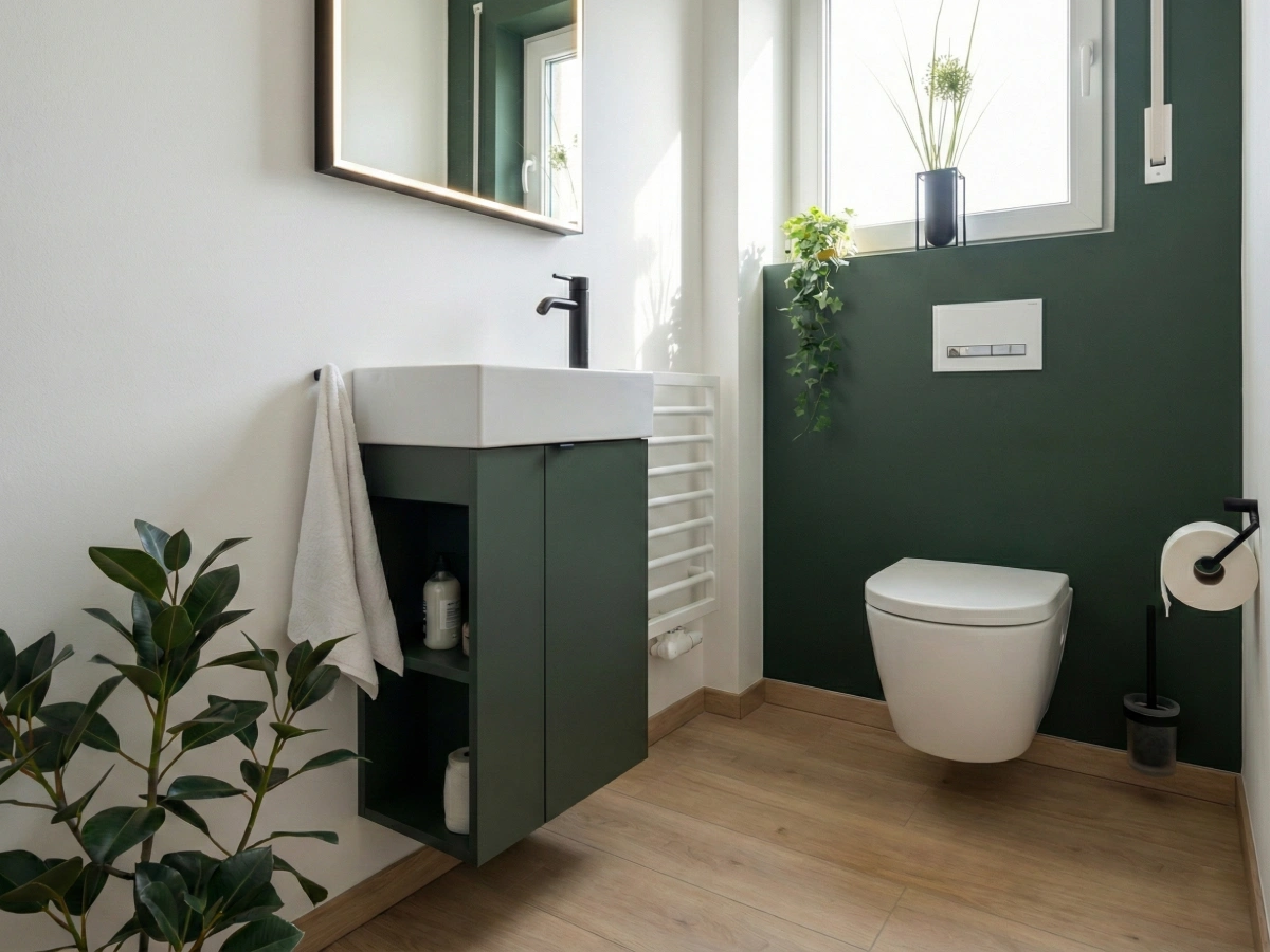 Modernes Farbkonzept: Die Kombination aus tiefem Grün, warmem Holz und Weiß sorgt für eine stilvolle und harmonische Atmosphäre.