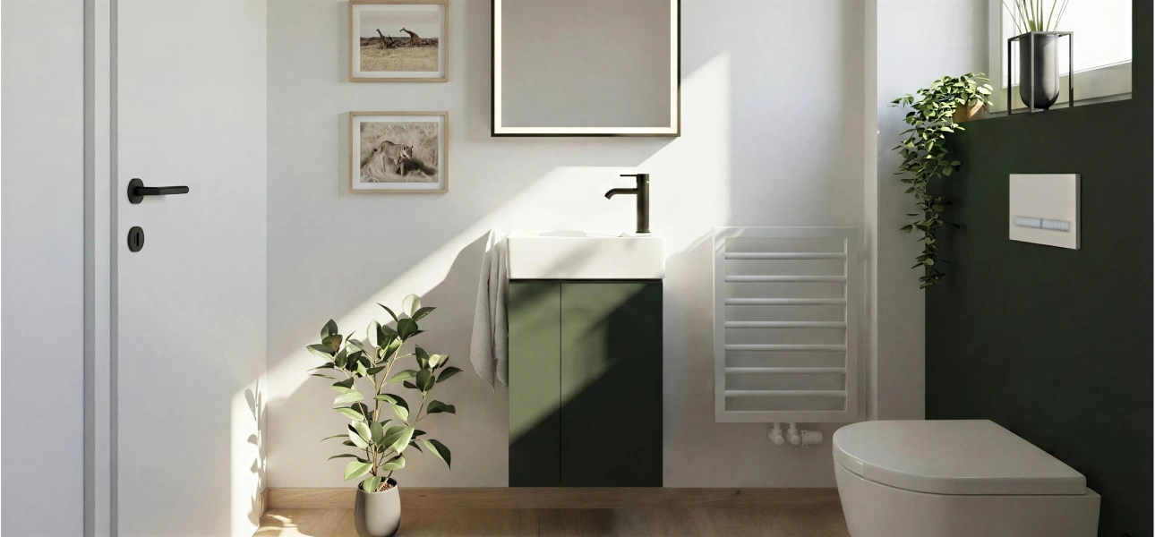 Ein modernes Farbkonzept aus Grün, Holz und Weiß bringt Frische und Eleganz. Schwarze Details setzen stilvolle Akzente.