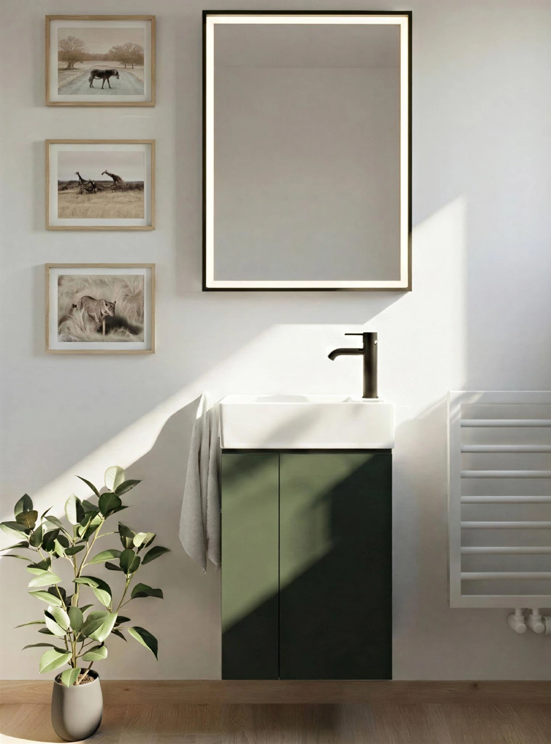Die Kombination aus klaren Linien, natürlichen Materialien und sanften Lichtakzenten schafft eine ruhige und einladende Atmosphäre im Bad.